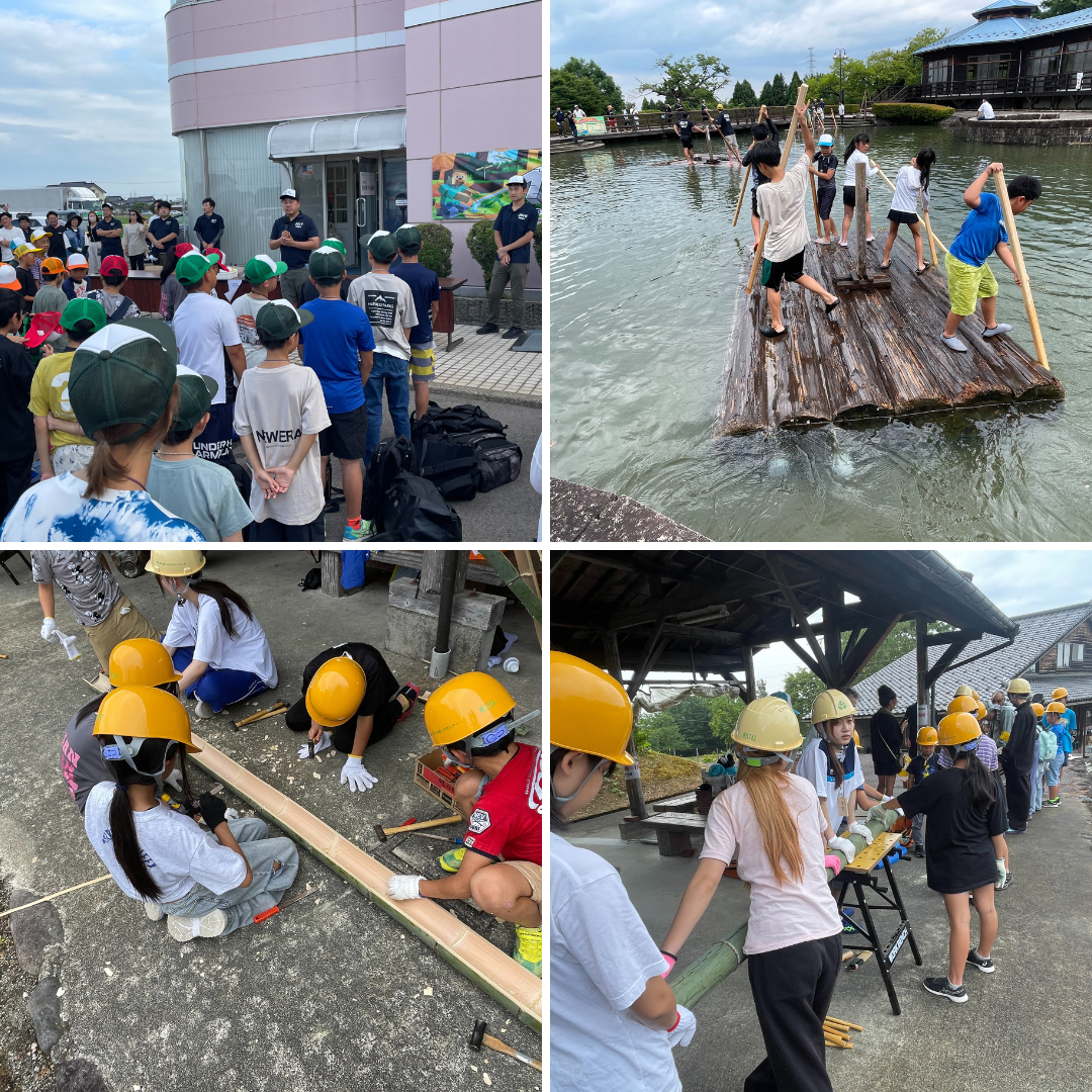 1日目は、いかだレースと流しそうめんのレーン作りを行いました。いかだレースでは、タイムトライアルを行い、各班のメンバーが協力して、いかだを操作しました。池に落ちたり、なかなか前に進まなかったり、悪戦苦闘しながらも、それぞれのベストタイムを目指しました。